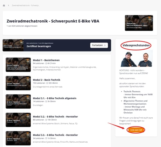 Den Link zur Sprechstunde findest du in der Akademie am rechten Seitenrand.